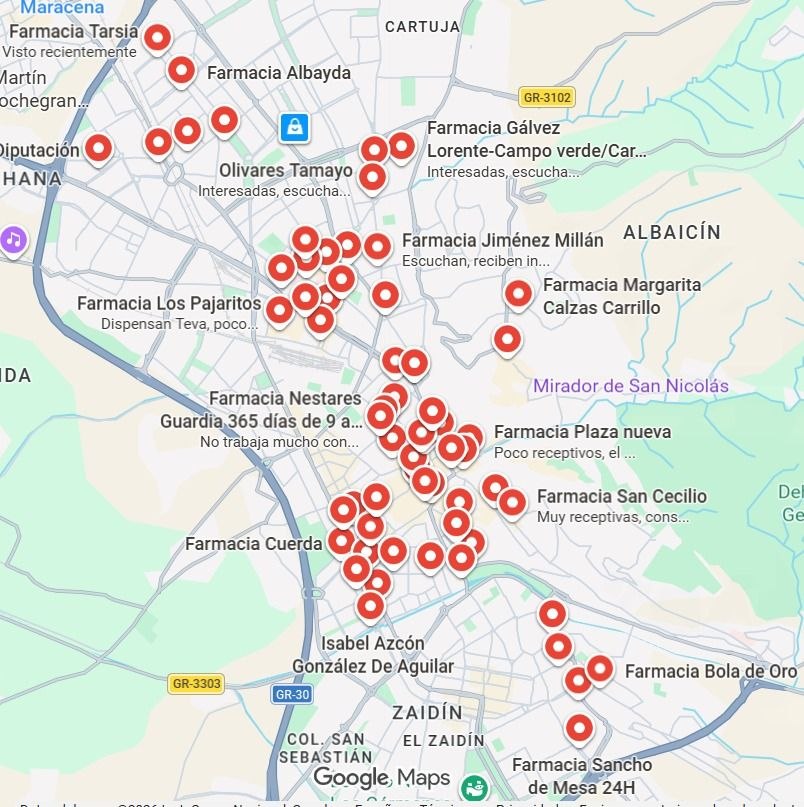 El equipo de la Campaña en Granada se repartió los diferentes barrios de Granada en equipos de 2-3 personas, que visitaron todas las farmacias que pudieron . Allí explicaron la Campaña a las trabajadoras de la farmacia y, en lo posible, a la propietaria o propietario de la oficina si estaban presentes. Se dejó información escrita, octavillas, tripticos y el cartel por si querían colocarlo en la puerta, comprometiéndose a no dispensar Teva. Algunas lo hicieron